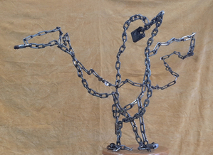 2025Wandsculptuur vliegende vogel, uit kettingen van fietssloten, bandenlichters etc. Al het materiaal is gevonden op straat.